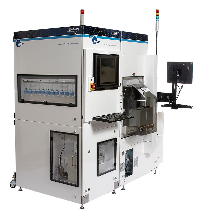 The 2300 NPT-2 Particle Deposition System at right used in our Particle Deposition Lab in the production of Calibration Wafer Standards, uses Recipe Control which includes all the operating parameters for the PDS to reproduce Calibration Wafer Standards to a specific customer specification for size accuracy, whether it is a single full particle  deposition on a 100mm wafer or a Spot Deposition of 4-11 particle diameters on a 300mm wafer.