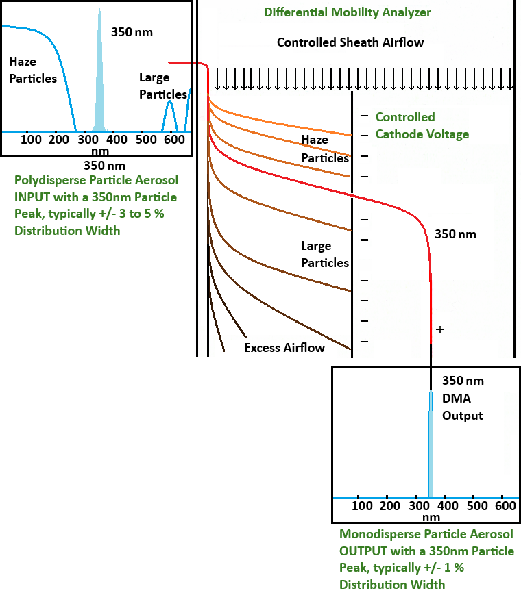 The image above describes a basic design of a particle deposition system in which a Differential Mobility Analyzer (DMA) is the key scientific tool used to isolate a narrow particle size peak on the output of the DMA, using very fine control of an electrode voltage and airflow velocity. The input to the DMA is a composite particle spectrum generated by an upstream atomizer (not shown).